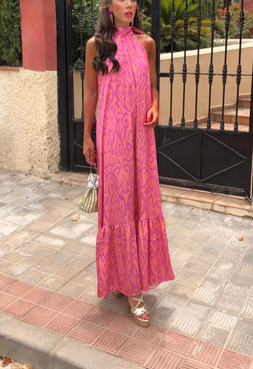 Vestido Rosa Estampado Gola Alta (S/M)